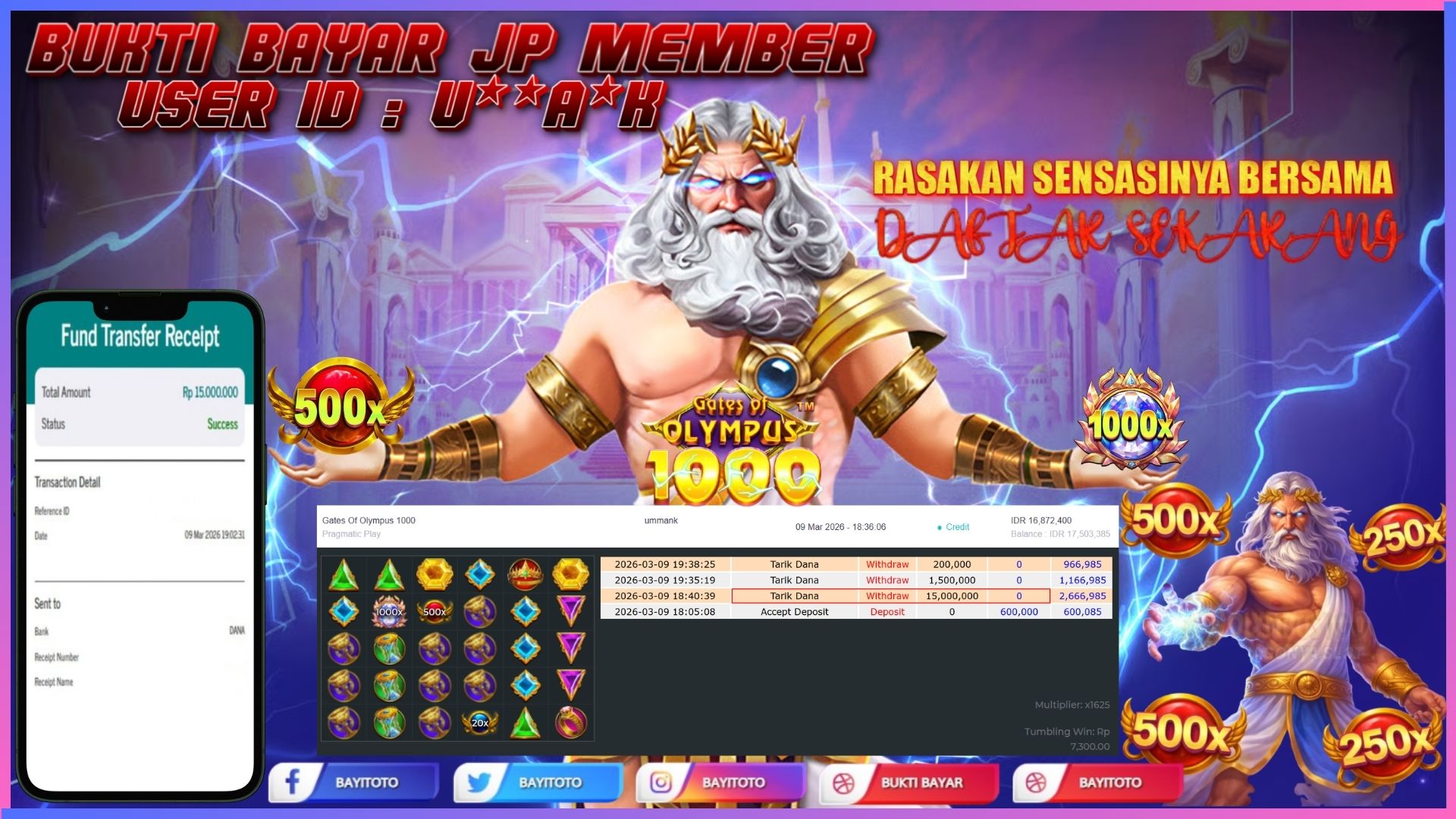 Selamat kepada User id : U**A*K Telah berhasil mendapatkan kemenangan besar pada